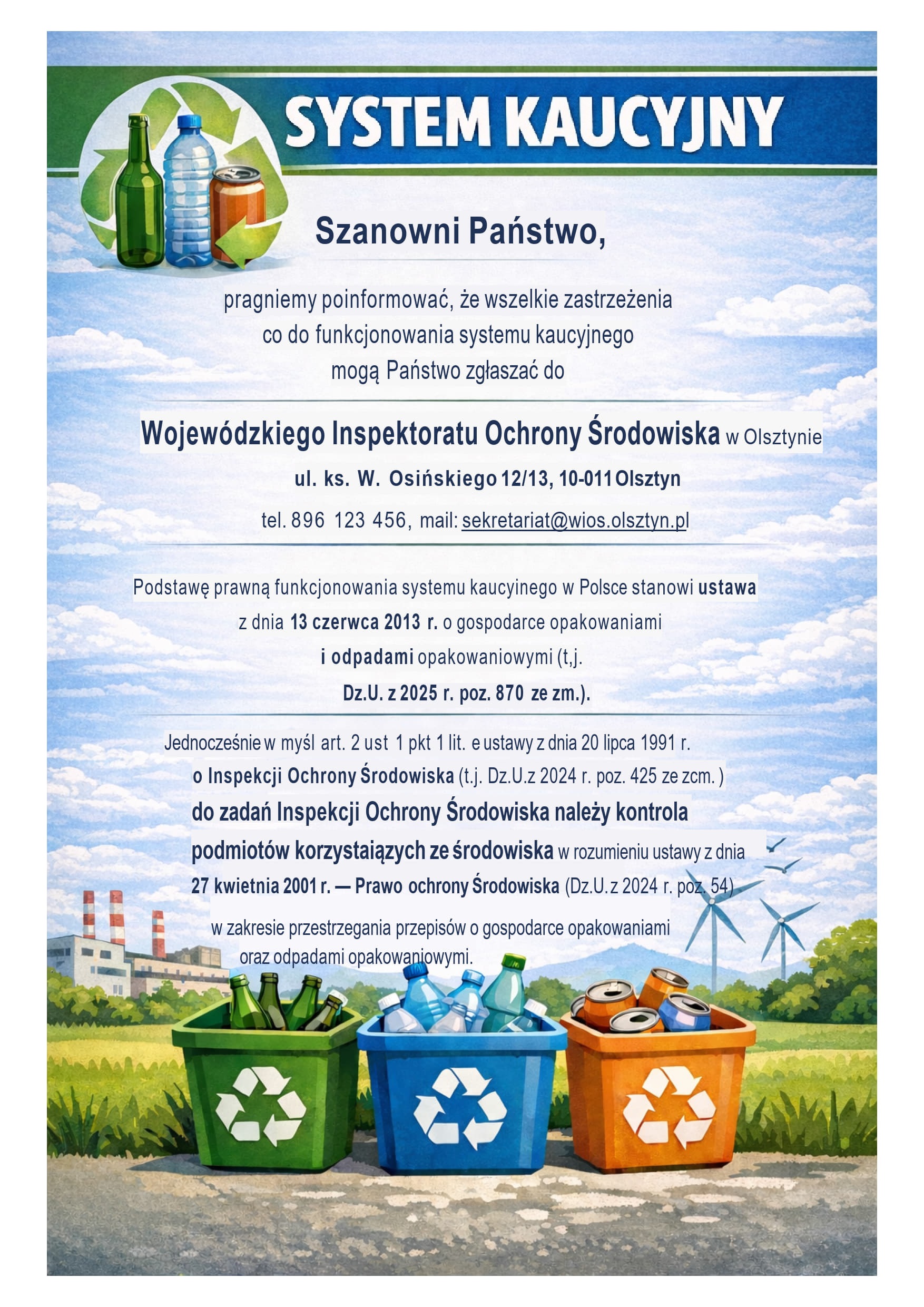 pragniemy poinformować, że wszelkie zastrzeżenia co do funkcjonowania systemu kaucyjnego mogą Państwo zgłaszać do Wojewódzkiego Inspektoratu Ochrony Środowiska w Olsztynie, ul. ks.